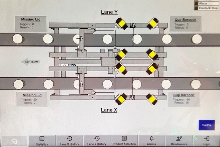 The customer requested a system that would inspect cup 1D barcodes on a two-lane conveyor system at a rate of 300 cups/min on each lane. The conveyor line speed was specified to be more than 200 ft/min. A 4-reader synchronized system was designed to provide 360-degree coverage around each cup. With a 65ms window to capture 4 images, transfer results, and validate the transferred results, proper lighting and tuning of image acquisition was critical. Extensive in-house testing was necessary to validate the system's performance prior to on-site commissioning.