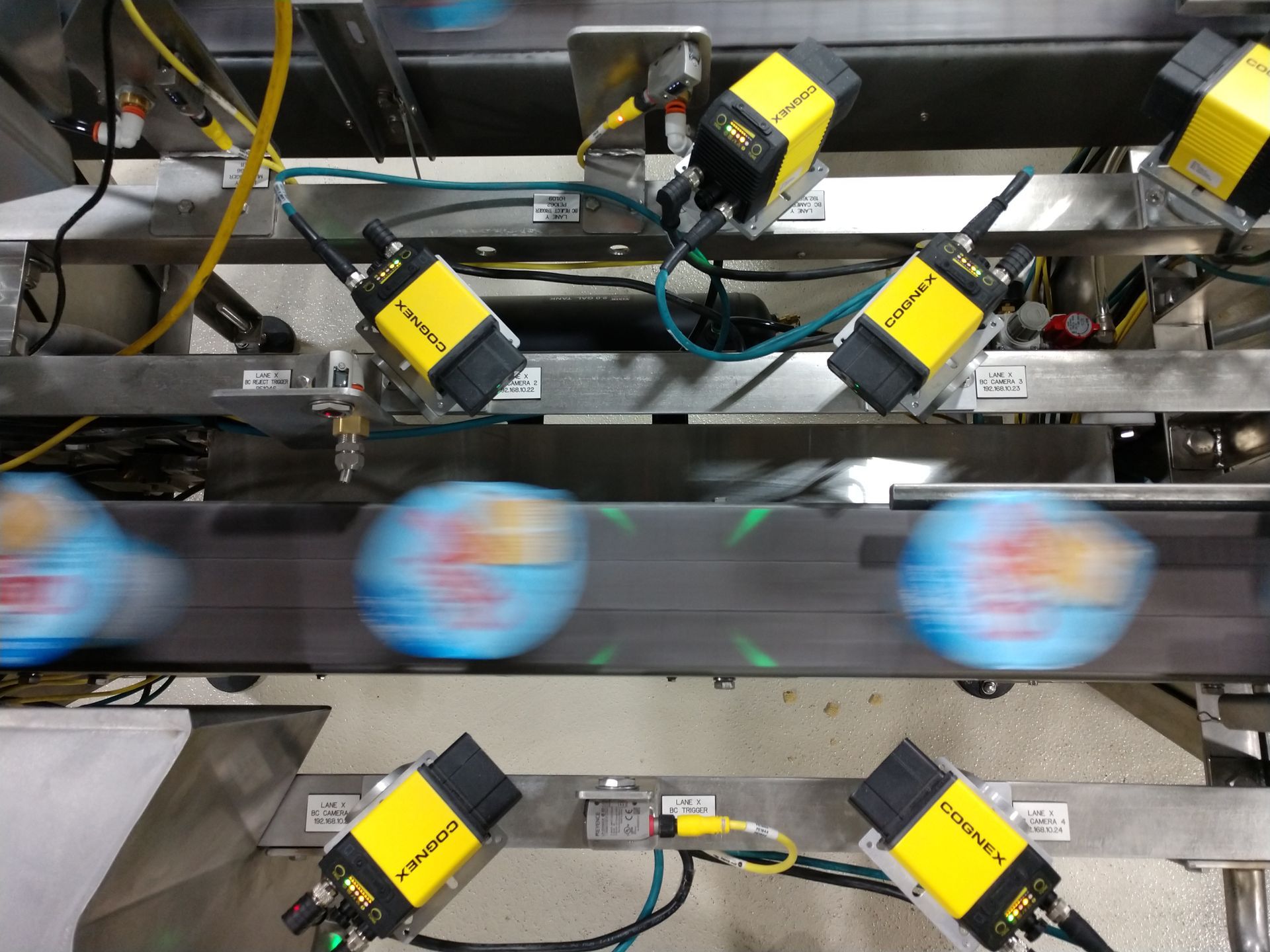 The customer requested a system that would inspect cup 1D barcodes on a two-lane conveyor system at a rate of 300 cups/min on each lane. The conveyor line speed was specified to be more than 200 ft/min. A 4-reader synchronized system was designed to provide 360-degree coverage around each cup. With a 65ms window to capture 4 images, transfer results, and validate the transferred results, proper lighting and tuning of image acquisition was critical. Extensive in-house testing was necessary to validate the system's performance prior to on-site commissioning.